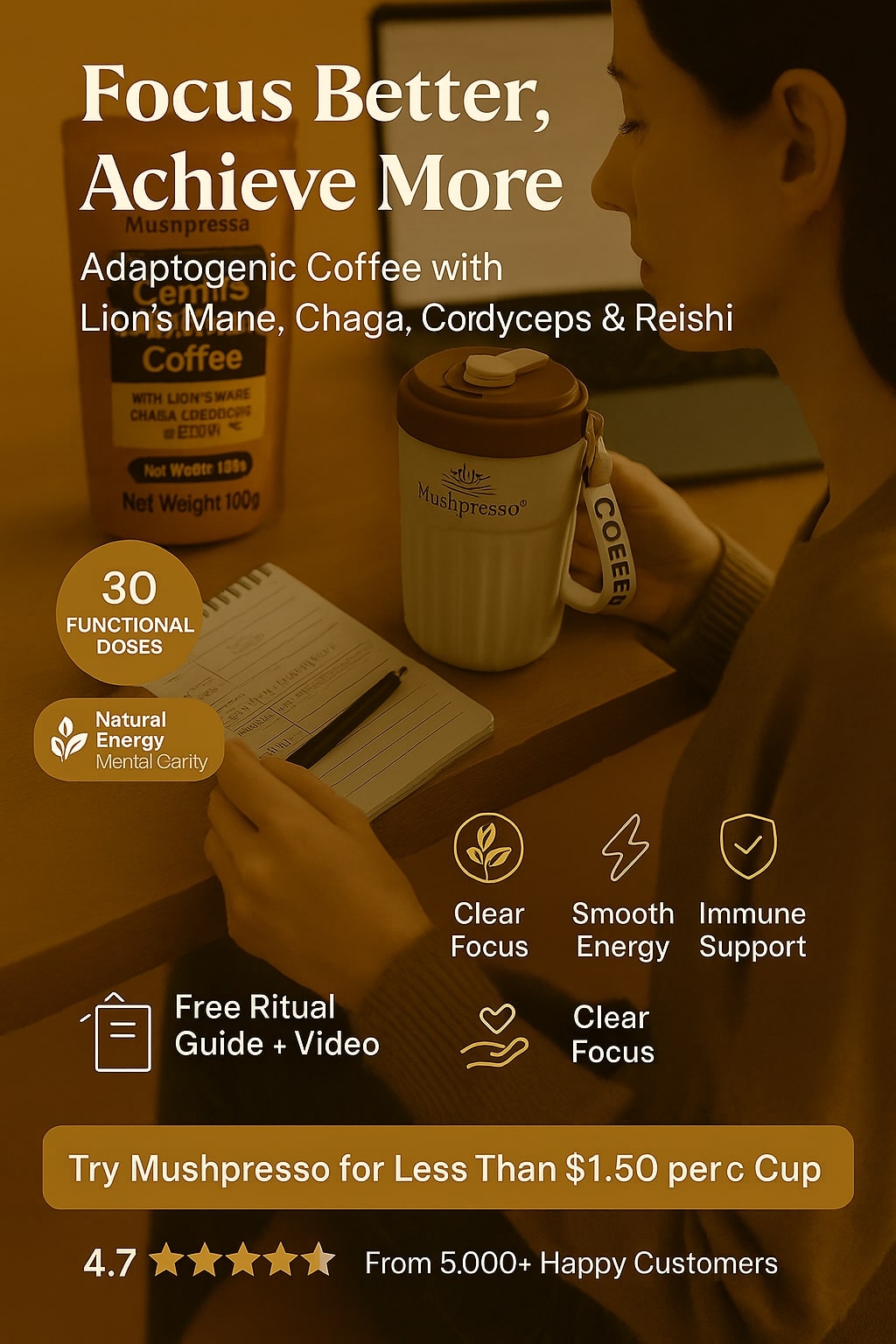 (Cu cafea Arabica prăjită intens, Lion’s Mane și Chaga – pentru concentrare puternică, claritate mentală și energie echilibrată.)